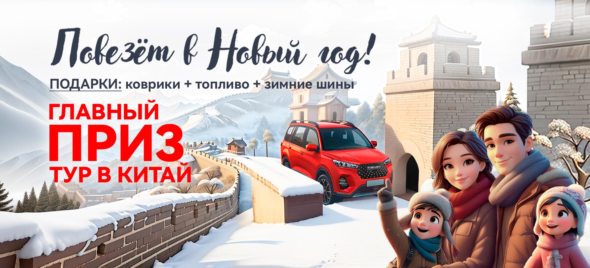 При покупке автомобиля получите в подарок зимние шины, коврики, топливо, а также участвуйте в розыгрыше поездки в Китай и множества других призов!