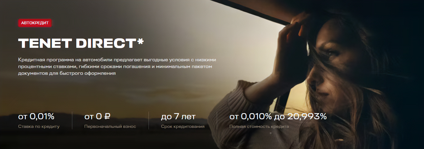 TENET ВОСТОЧНЫЙ ВЕТЕР представляет эксклюзивные кредитные условия от 0,01%* на весь модельный ряд TENET. Управляйте современным автомобилем, выбирая максимально комфортные условия покупки. Каждое ваше путешествие станет еще приятнее с выгодным кредитным предложением от TENET.