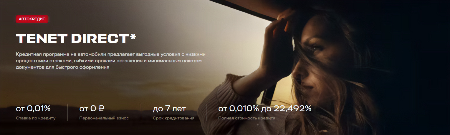TENET ВОСТОЧНЫЙ ВЕТЕР представляет эксклюзивные кредитные условия от 0,01%* на весь модельный ряд TENET. Управляйте современным автомобилем, выбирая максимально комфортные условия покупки. Каждое ваше путешествие станет еще приятнее с выгодным кредитным предложением от TENET.